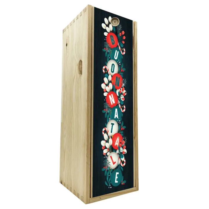 Wooden box for standard wine bottle - 0.75 lt. - Happy Christmas! Garland - Personalized box with themed sticker for Christmas - gift box for bottle of wine or sparkling wine