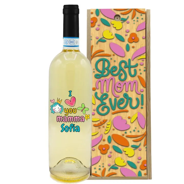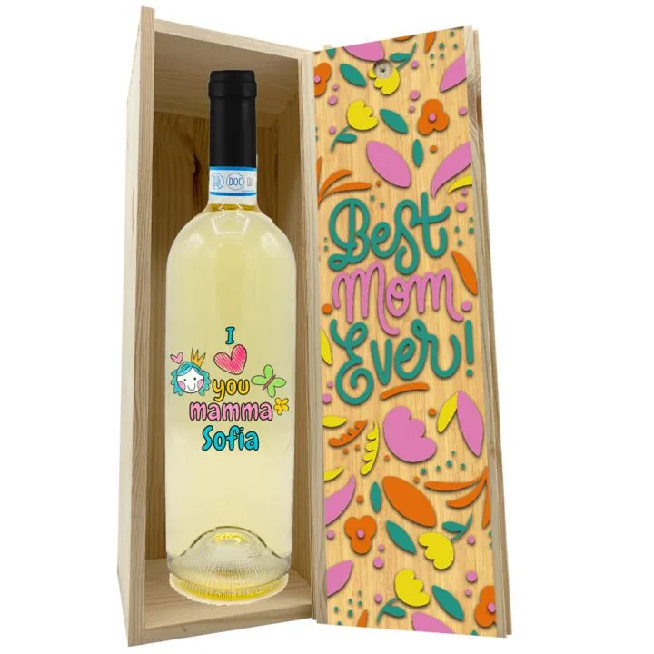 Pinot Grigio DOC - 0.75 lt. - Original gift idea for Mother's Day. Personalized bottle with dedication, with wooden box. Surprise your mum with a personalized and original gift!