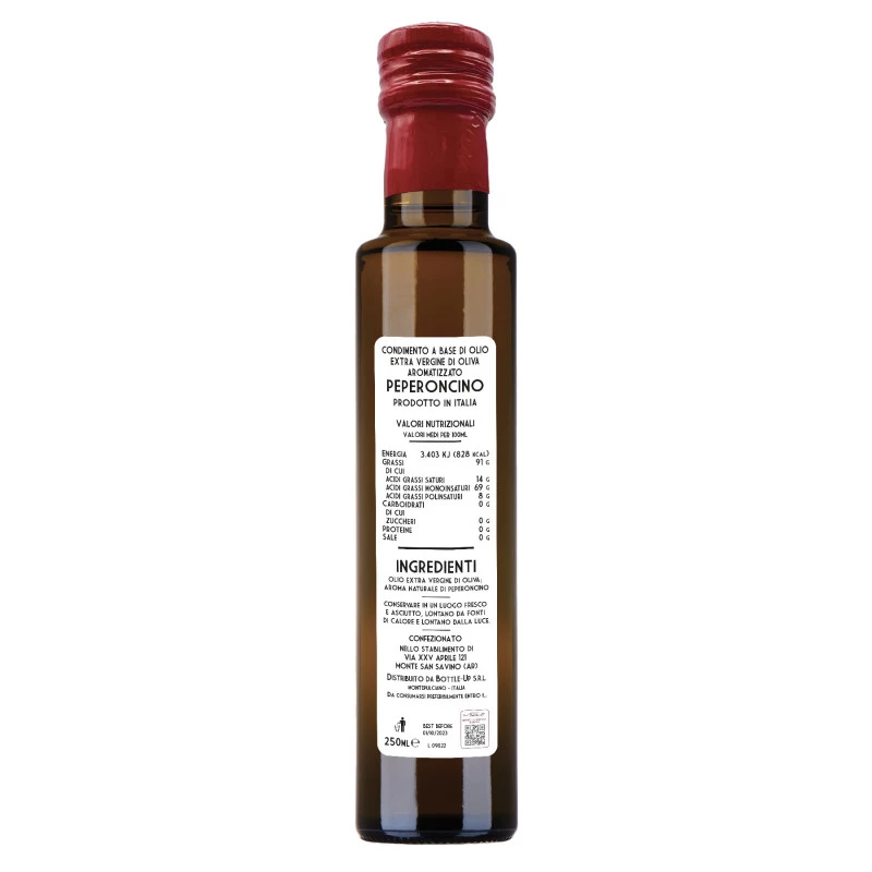 TIPOLOGIA: condimento a base di olio extra vergine di oliva 100% italiano e peperoncino