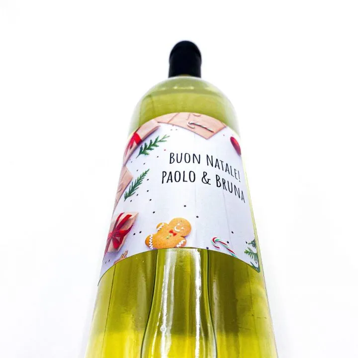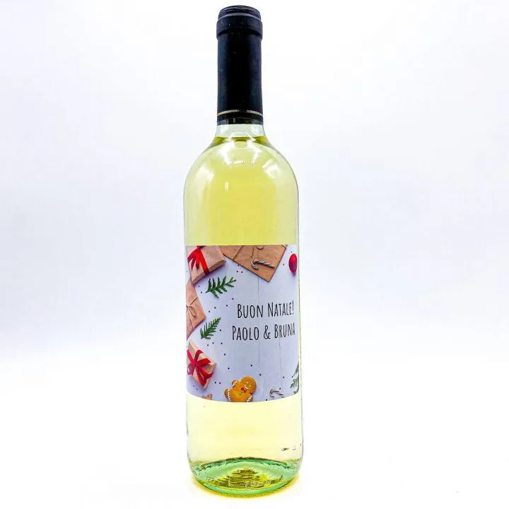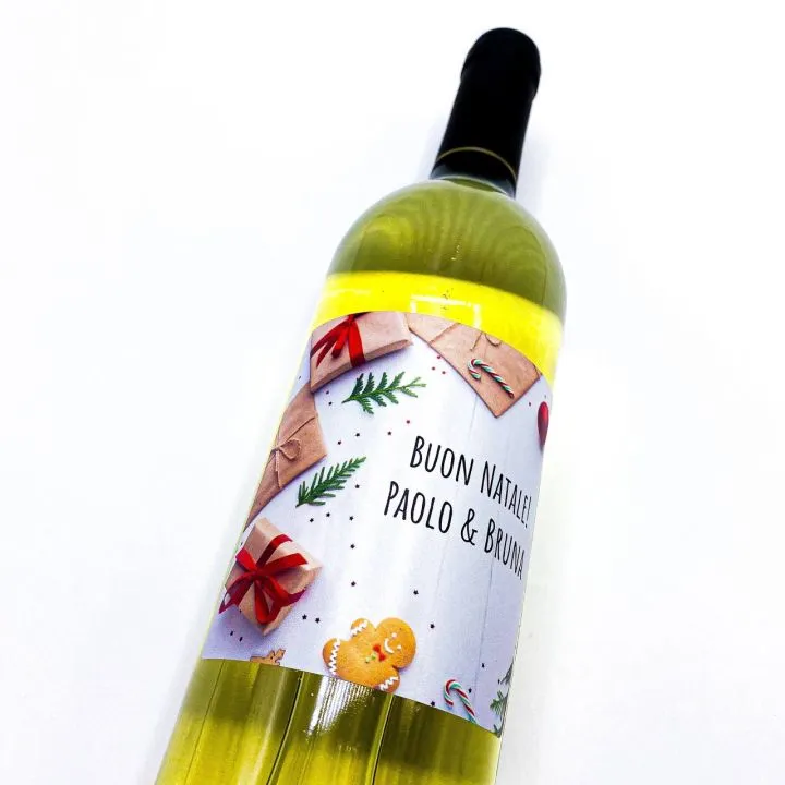 Bottiglia di vino Chardonnay con etichetta personalizzata come idea regalo per Natale. Aggiungi la tua dedica e invia i tuoi auguri natalizi
