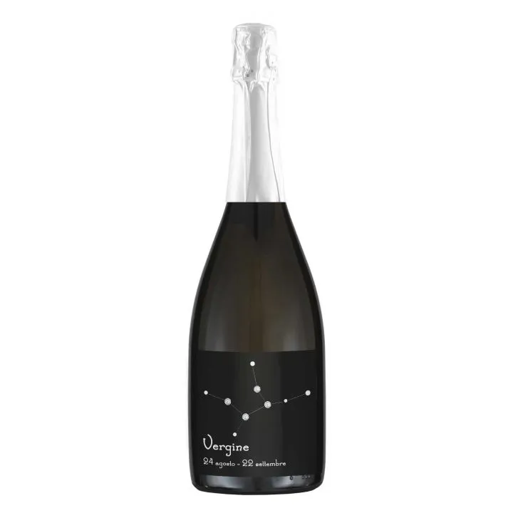 Prosecco Extra Dry DOC - 0.75 lt. - Originale idea regalo compleanno personalizzato con segno zodiacale VERGINE. Etichetta con effetto argento e brillante in rilievo. Aggiungi la tua dedica per il festeggiato nato sotto il segno del VERGINE.