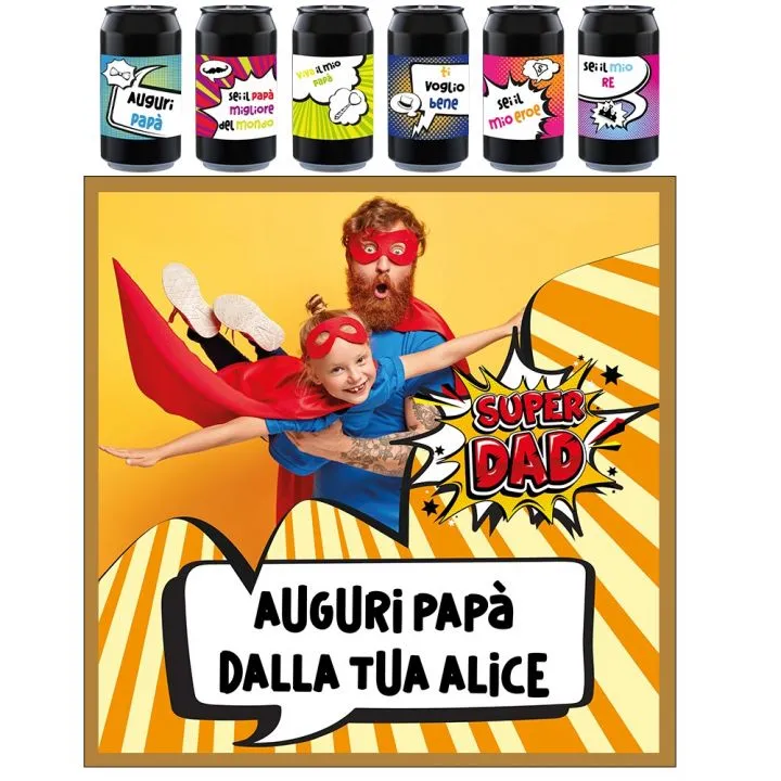 6 lattine 0.33 lt. - Birra Artigianale Amber Ale con etichetta personalizzata e scatola con coperchio personalizzato per FESTA DEL PAPA'. Aggiungi la tua personalizzazione e usa il coperchio come quadro-fotografico! Sorprendi il tuo papà per il prossimo 19 Marzo!