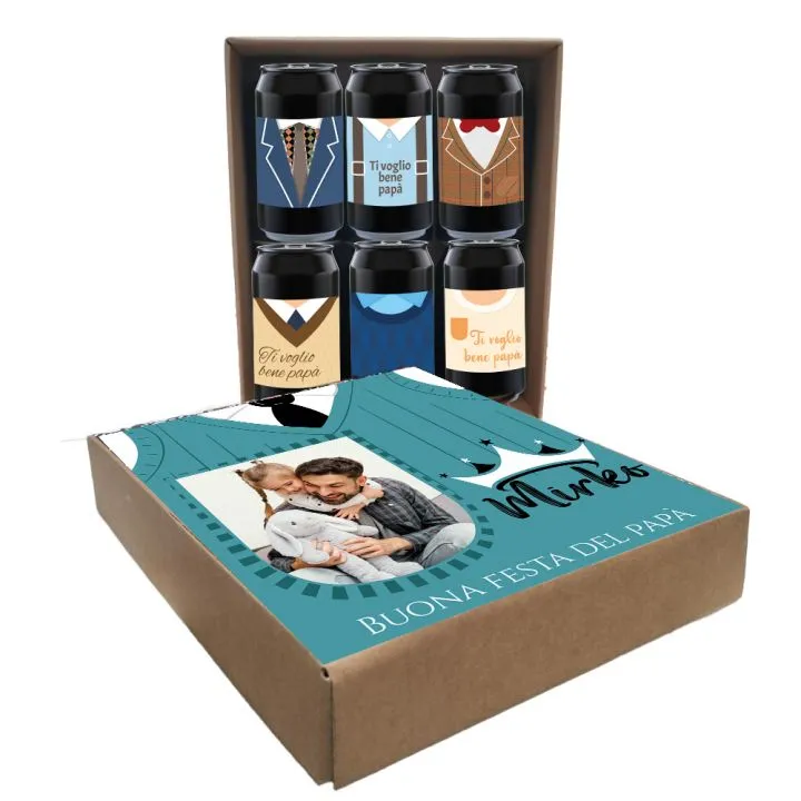 6 lattine 0.33 lt. - Birra Artigianale Amber Ale con etichetta personalizzata e scatola con coperchio personalizzato per FESTA DEL PAPA'. Aggiungi la tua personalizzazione e usa il coperchio come quadro-fotografico! Sorprendi il tuo papà per il 19 marzo!