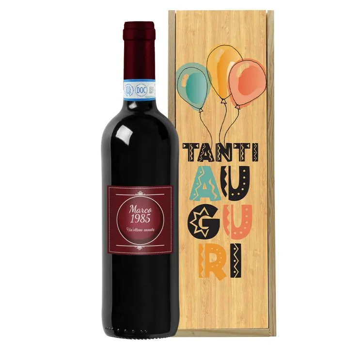 Montepulciano d'Abruzzo DOC - 0.75 lt. con cassetta in legno personalizzata per compleanno - bottiglia con etichetta personalizzata e cassetta porta-bottiglia in legno. Personalizza l'etichetta per un regalo originale e unico.