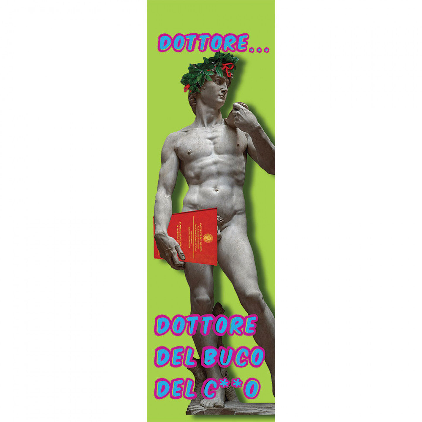 Cassetta in legno per bottiglia di vino standard – 0.75 lt. – Dottore, dottore…! – Scatola personalizzata con adesivo a tema per laurea – confezione regalo per bottiglia – David di Michelangelo
